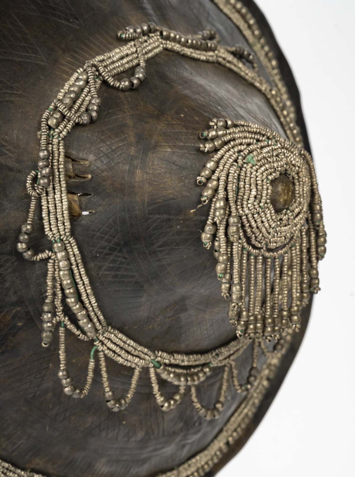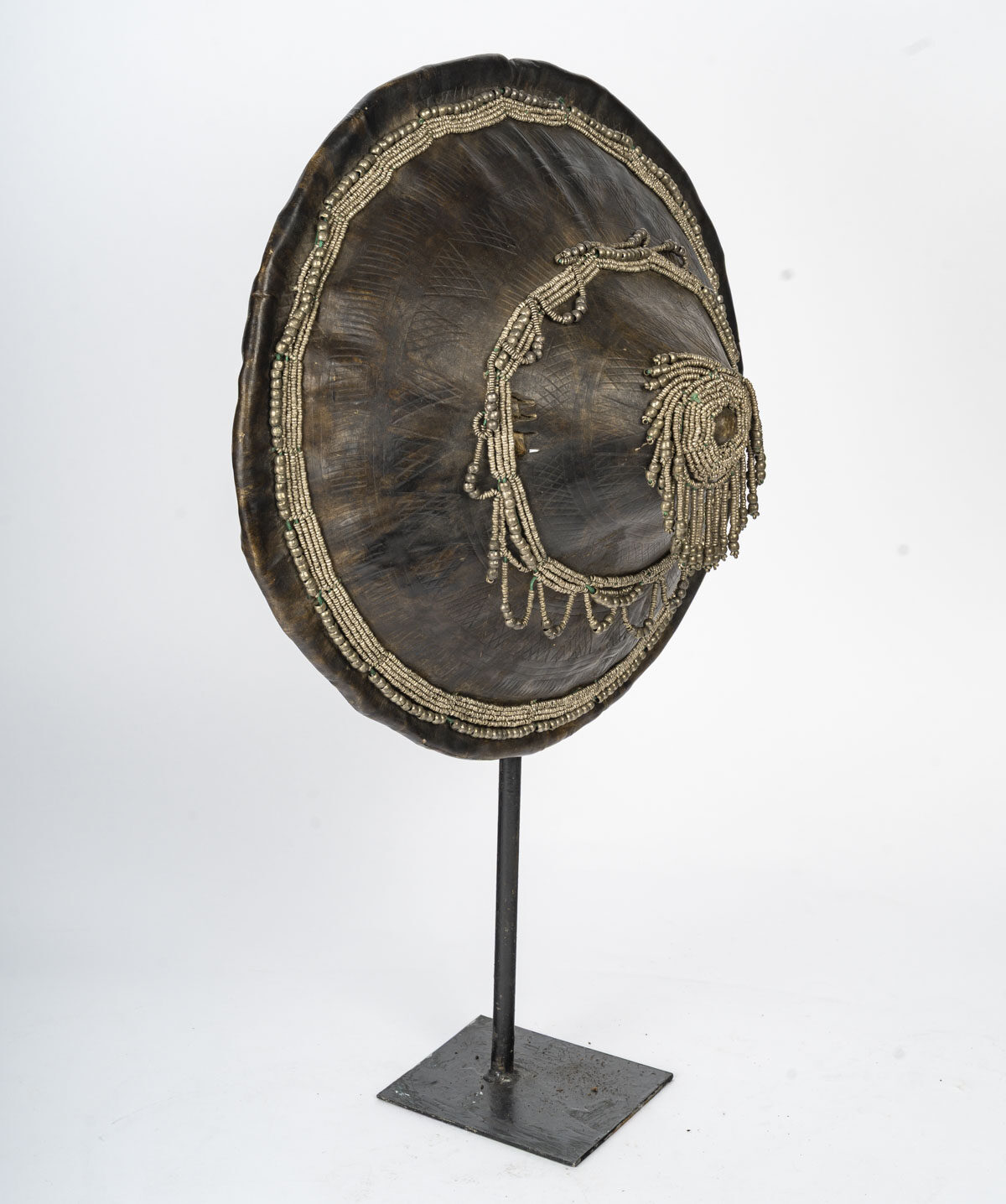 This circular shield is made of thick leather, adorned with incised geometric patterns and richly decorated with metal beads arranged in rays and garlands. The decorations attest to its role as a symbol of prestige, beyond its purely defensive function.