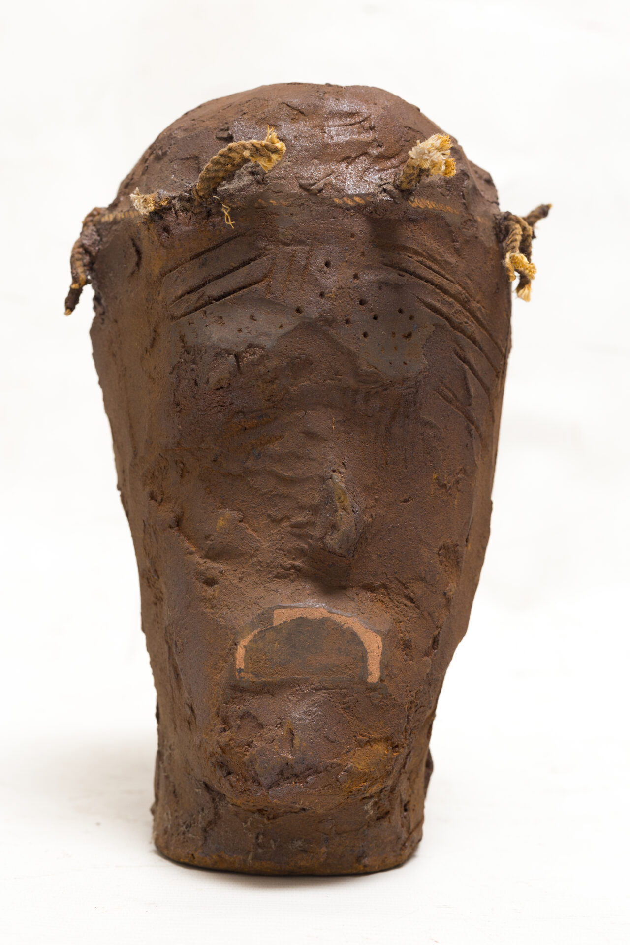 This head, rough and deeply scarred, bears knotted ropes that seem to pierce through the material. The barely sketched face appears trapped in a vise, where wrinkles, hollows, and a carved mouth testify to a heavy and silent story. The perforations and scars intensify the impression of a body marked by suffering, yet still standing.