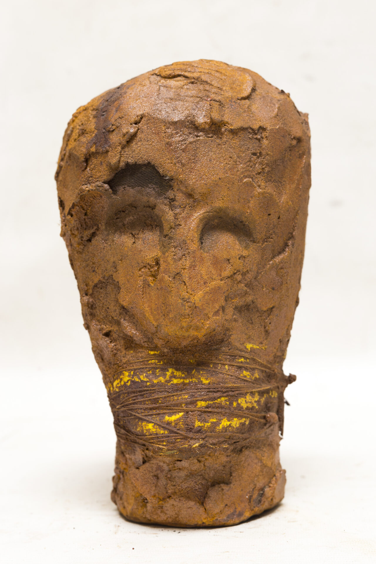 This head is marked by visible fractures, like a broken but still present memory. The flaking material gives the impression of archaeological layers.
