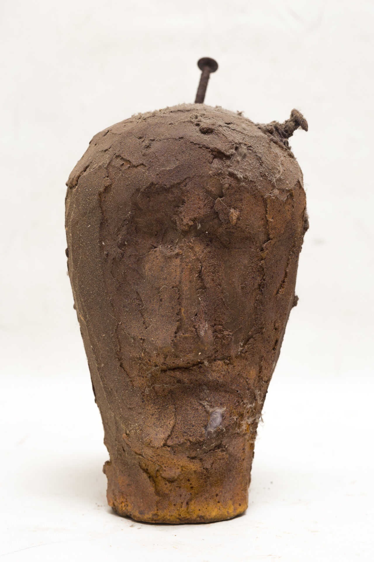 This head conveys the impression of a frozen whisper. Rust traces running across its surface resemble sound lines carved into matter, as though it preserved the echo of vanished voices.