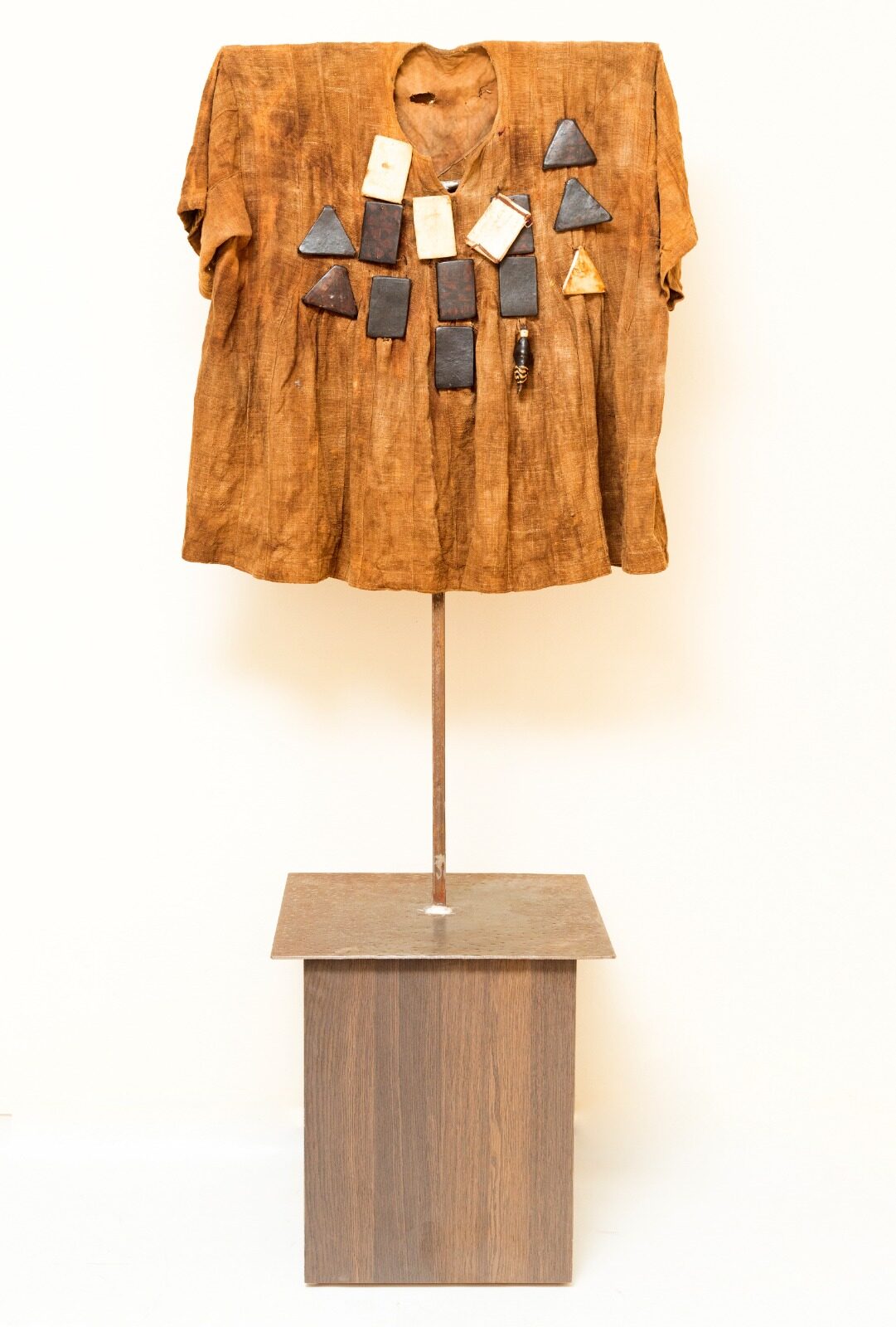 This tunic, tinted with earth and ochre, stands as a garment of memory and protection. The geometric amulets attached to the fabric recall ancestral practices of spiritual safeguarding, while resonating with a contemporary aesthetic of assemblage. Positioned between garment and sculpture, it embodies the symbolic power of raw materials – fibers, metal, wood – and their ability to carry invisible narratives. The work questions identity, transmission, and the survival of traditions within a contemporary framework.