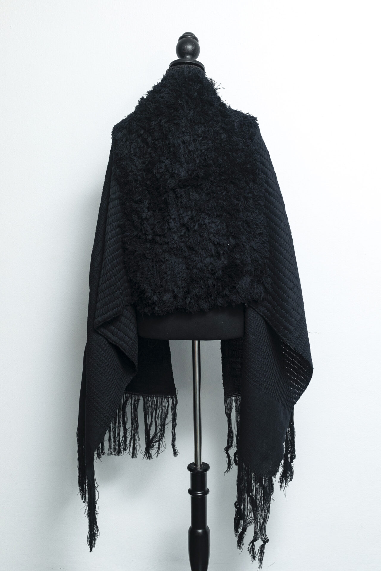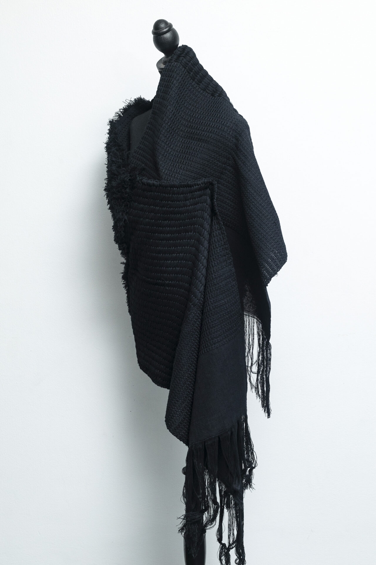 Its contrasting textures — soft, dense, and vibrant — recall cooled ashes or the surface of a stone polished by time. The fluid drape and hand-finished fringes lend the piece a deeply poetic and meditative presence.
