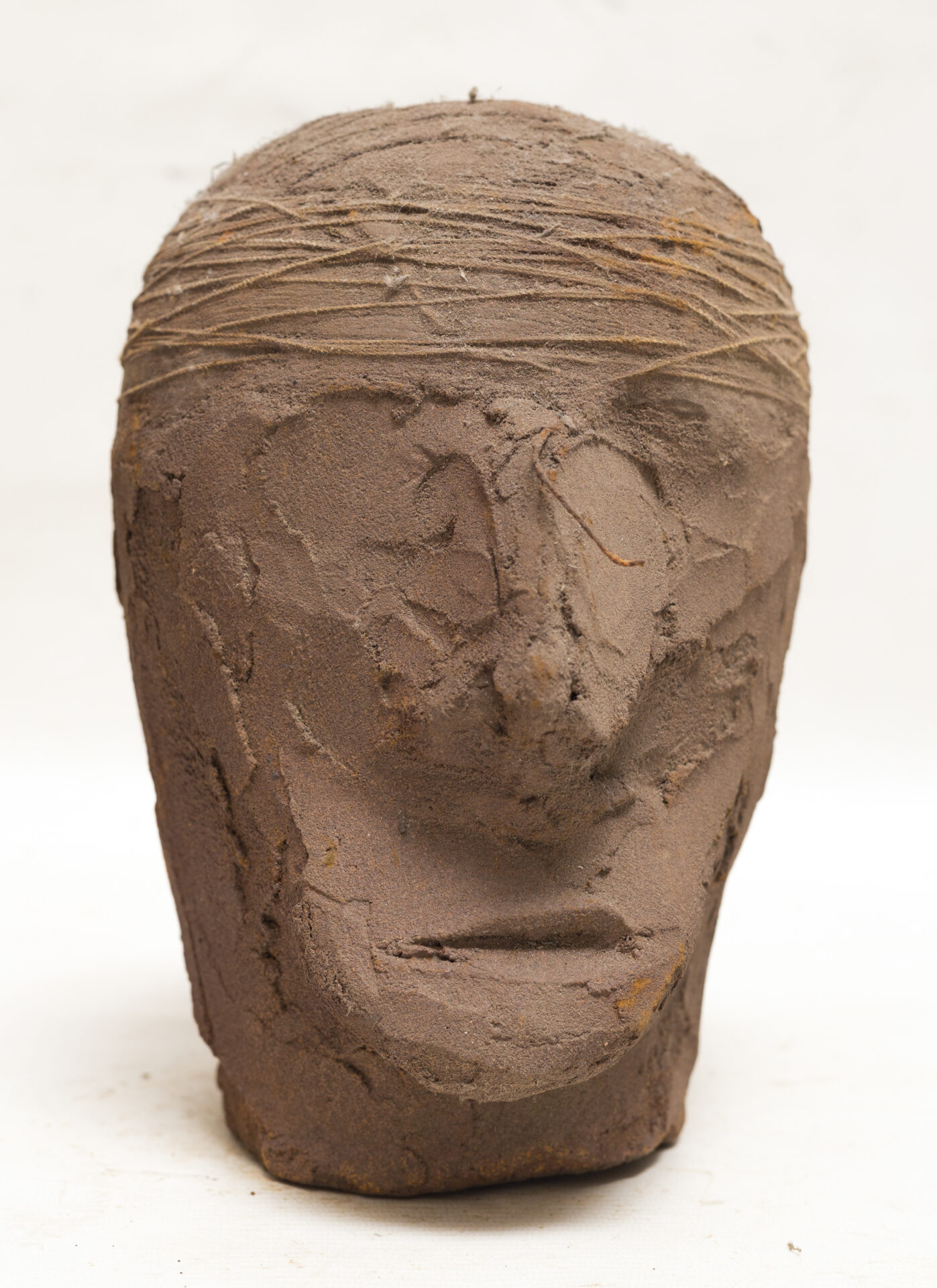 This head is marked by strings wrapped around the skull, resembling both a crown and a restraint. The roughly modeled and asymmetrical face reveals an incised mouth and a prominent nose. The eyes remain faint, blending into the raw surface of the clay. The whole figure evokes a tension between inner voice and imposed silence.