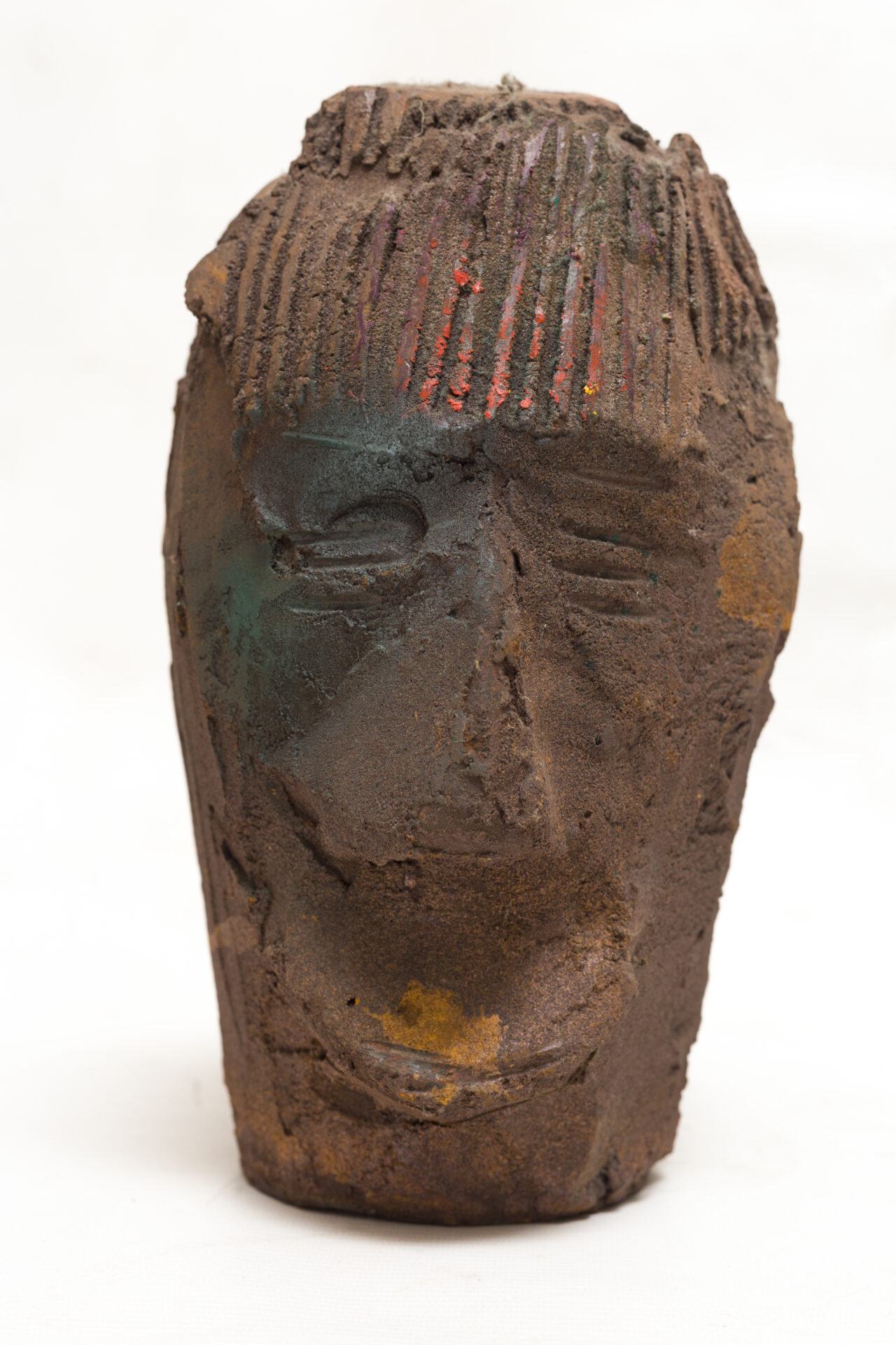 The head with colored scars symbolizes memory inscribed on body and skin. Each engraved line and pigment mark reminds us that both personal and collective histories are etched into flesh and clay.