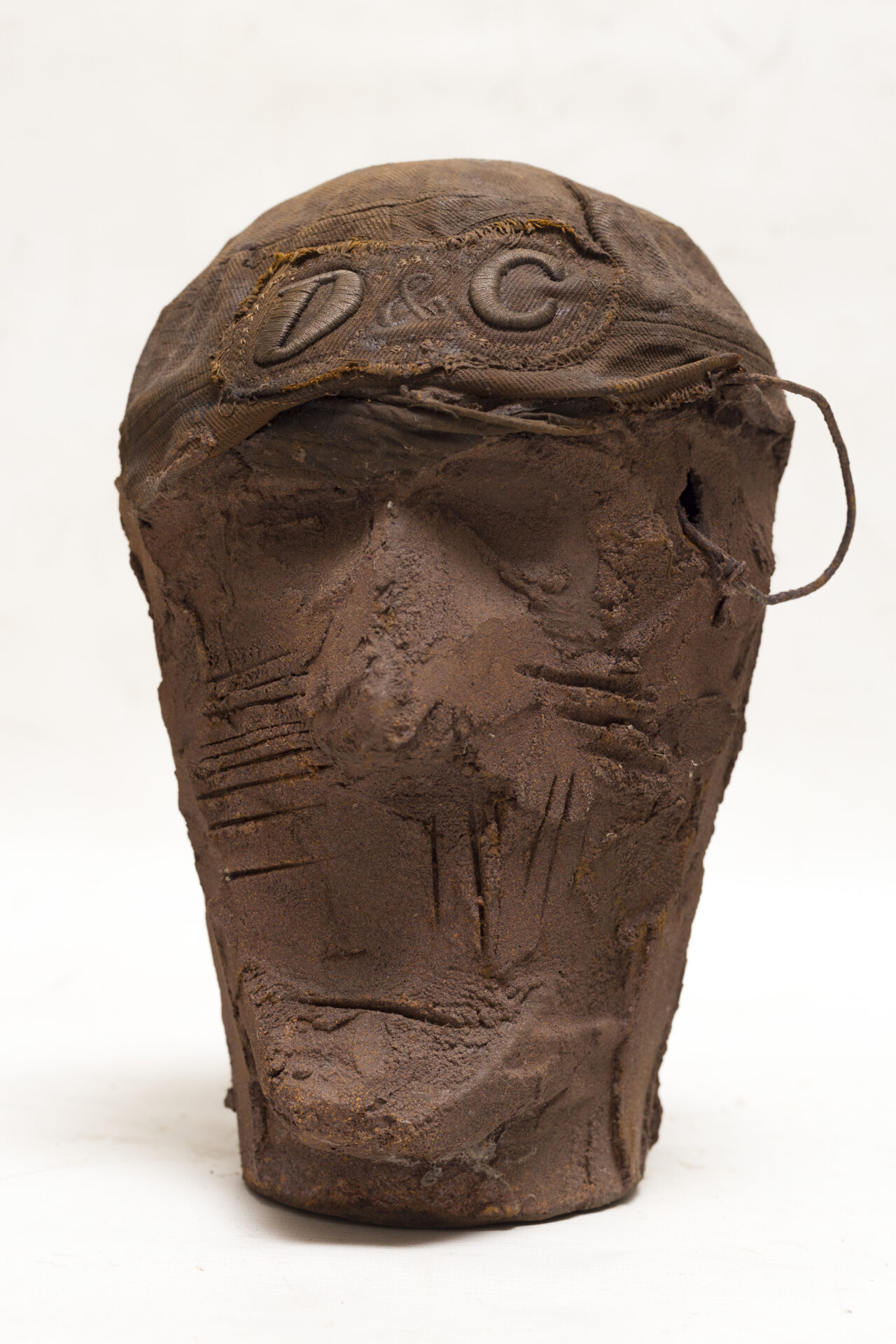 This head wears a cap marked with a luxury logo, standing in stark contrast with the raw and fragile terracotta. The face is barely shaped, its surface scarred with uncertain lines. The worn, tattered textile amplifies the gap between the illusion of prestige and the harshness of matter.
