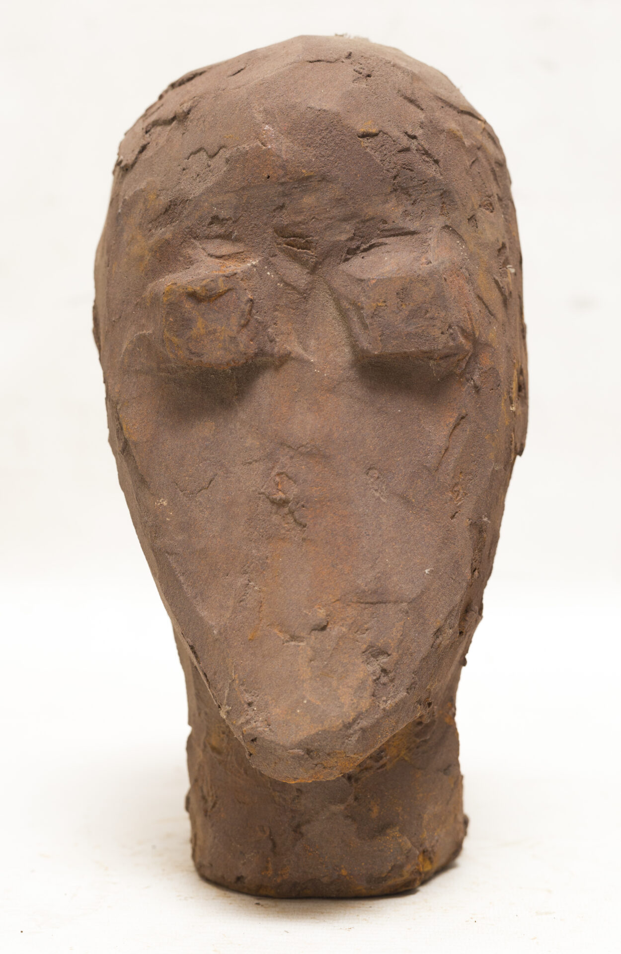This head, with its barely sketched features, seems to emerge from a raw block. The eyes are reduced to two square protrusions, almost closed, as if the gaze were withdrawn from the outside world. The mouth, meanwhile, blends into the material, leaving a face that hesitates between appearance and disappearance. The roughness of the surface recalls the texture of a stone torn from the earth.
