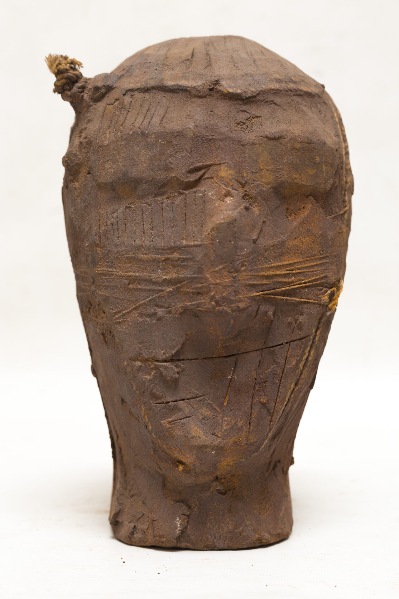 This terracotta sculpture, corroded by time, presents itself as a face in transformation. The rough texture and oxidized deposits evoke the erosion of time, which simultaneously erases, deforms, and reveals.